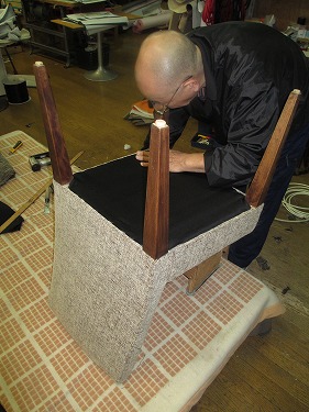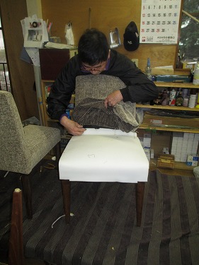 クッション(ウレタン)の補強が終わりましたら、 布を張っていきます。