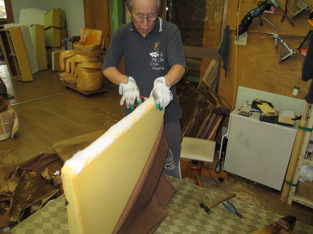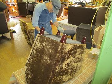 底の部分を剥しましたら、座の部分と肘の部分を外しまして、別々に生地を剥していきます。 肘の部分を剥しています。
