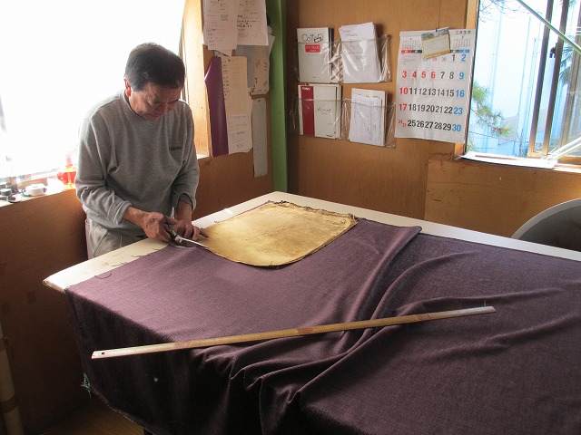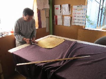 剥した生地をベースに新しい生地を作成していきます。 次にカットした生地をミシンで作成していきます。