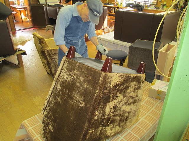 ホテルのチェアー張替です。 ここから生地を剥していきます。