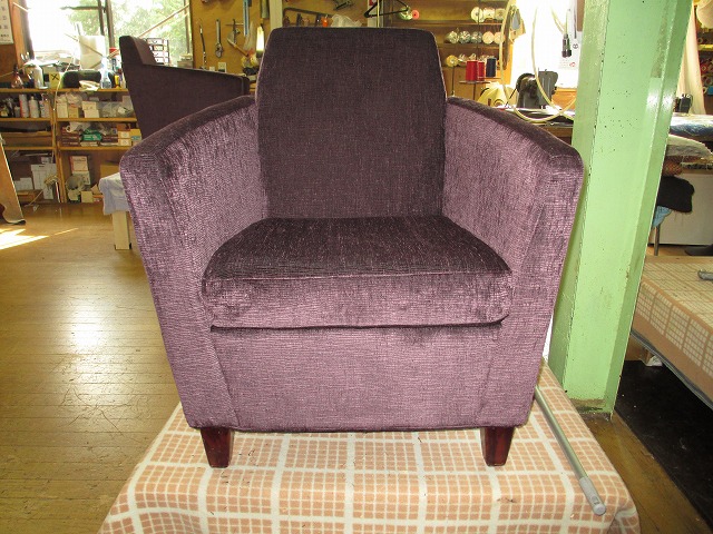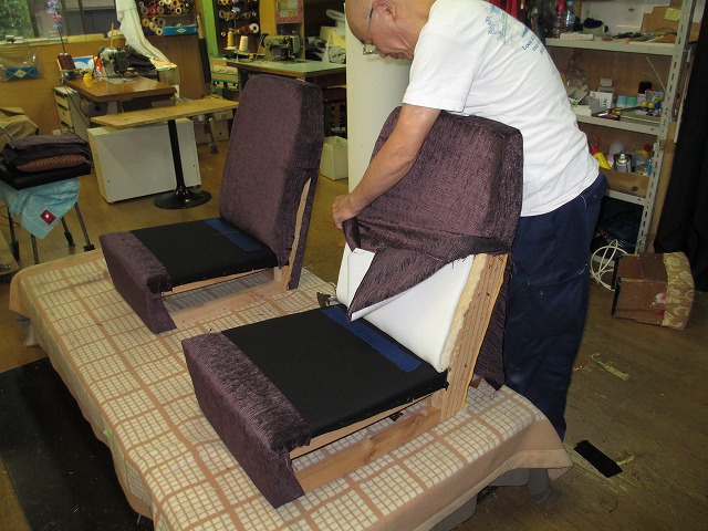 座と背の部分が張り終わり、肘も張りましたら、 肘と座の部分を組み立て完成です。