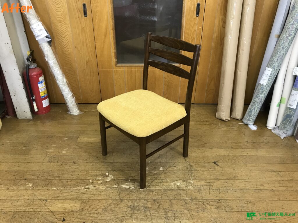 ダイニングチェア張替え後です♪ 生地は、モリデン、コンフォルトラミ(布)の黄色系になります。