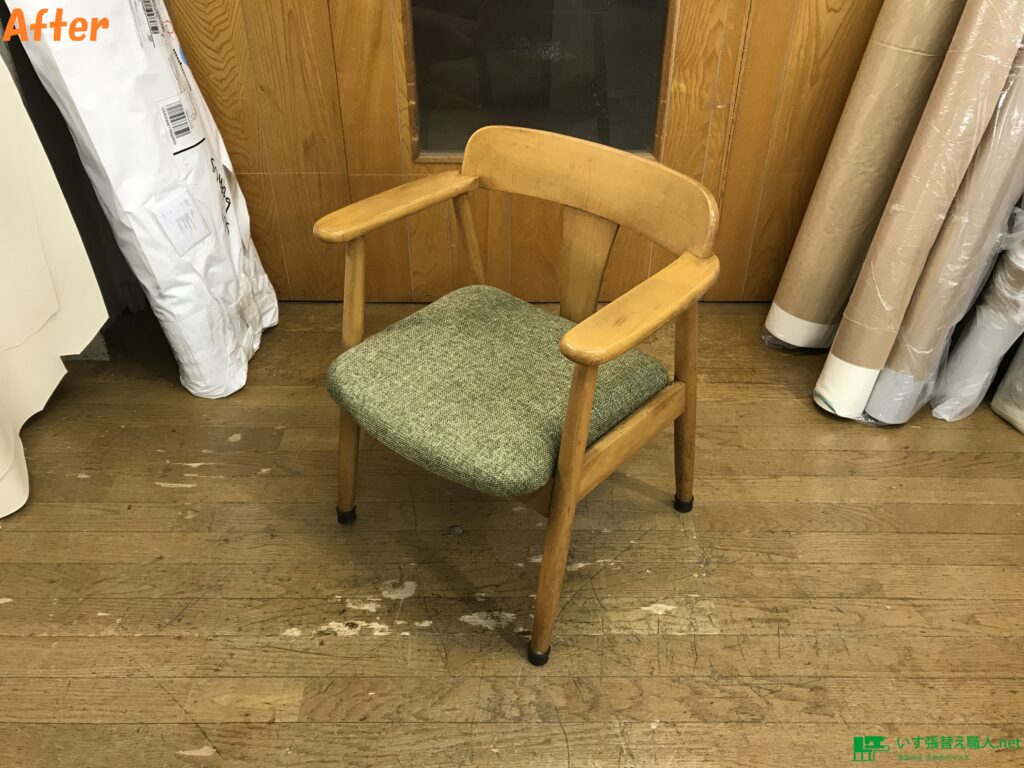 shirakawa社製ダイニングチェア張替え後です♪ 生地は、アイデイシー、ルーニー(布)の緑系になります。