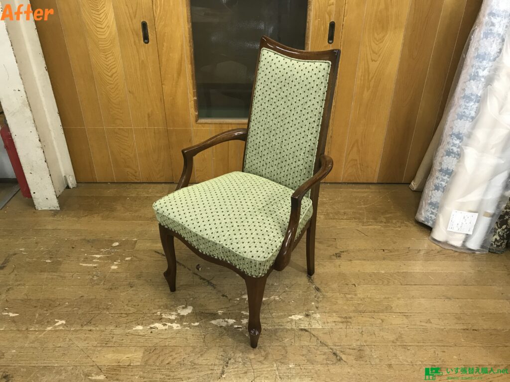 maruni社製ベルサイユチェア張替え後です♪ 生地は、サンゲツ、ステップスクエア(布)のグリーン系のドット柄になります。