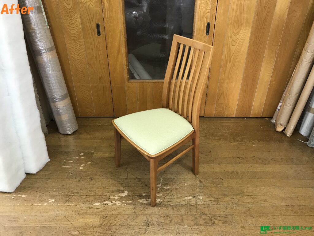 コスガ社製ダイニングチェア張替え後です♪ 生地は、シンコール、クレンズ(合皮)の緑系になります。